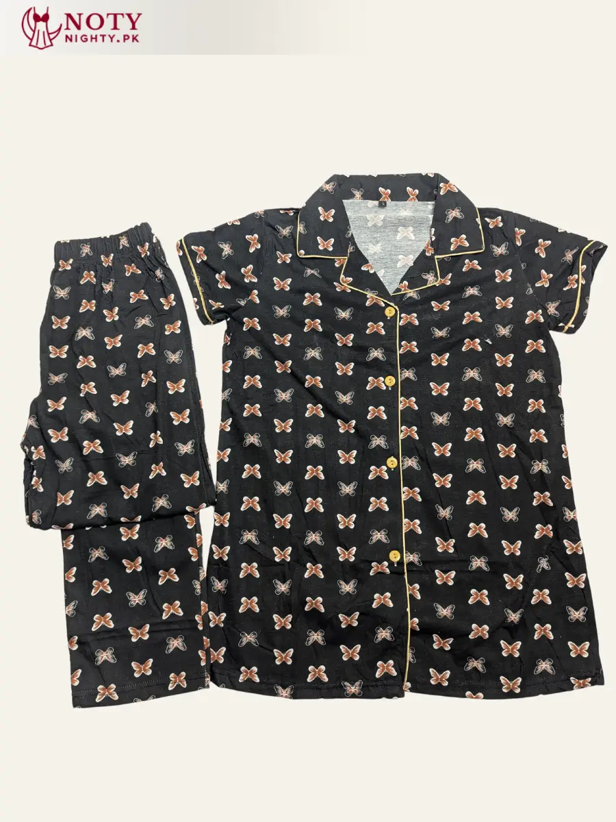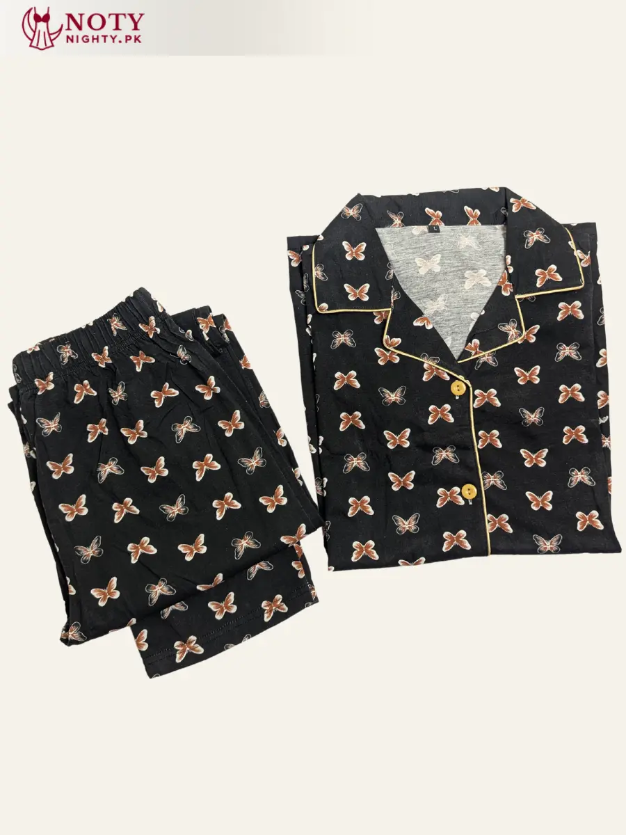 Elevate your nightwear style with this black printed shirt and pajama set, designed for women who love comfort with elegance. The butterfly-inspired print adds a playful charm to the classic black base. Made with breathable, soft fabric, it’s ideal for lounging and sleeping. The button-down shirt and comfy pajamas ensure a relaxed fit. A perfect blend of style and comfort.